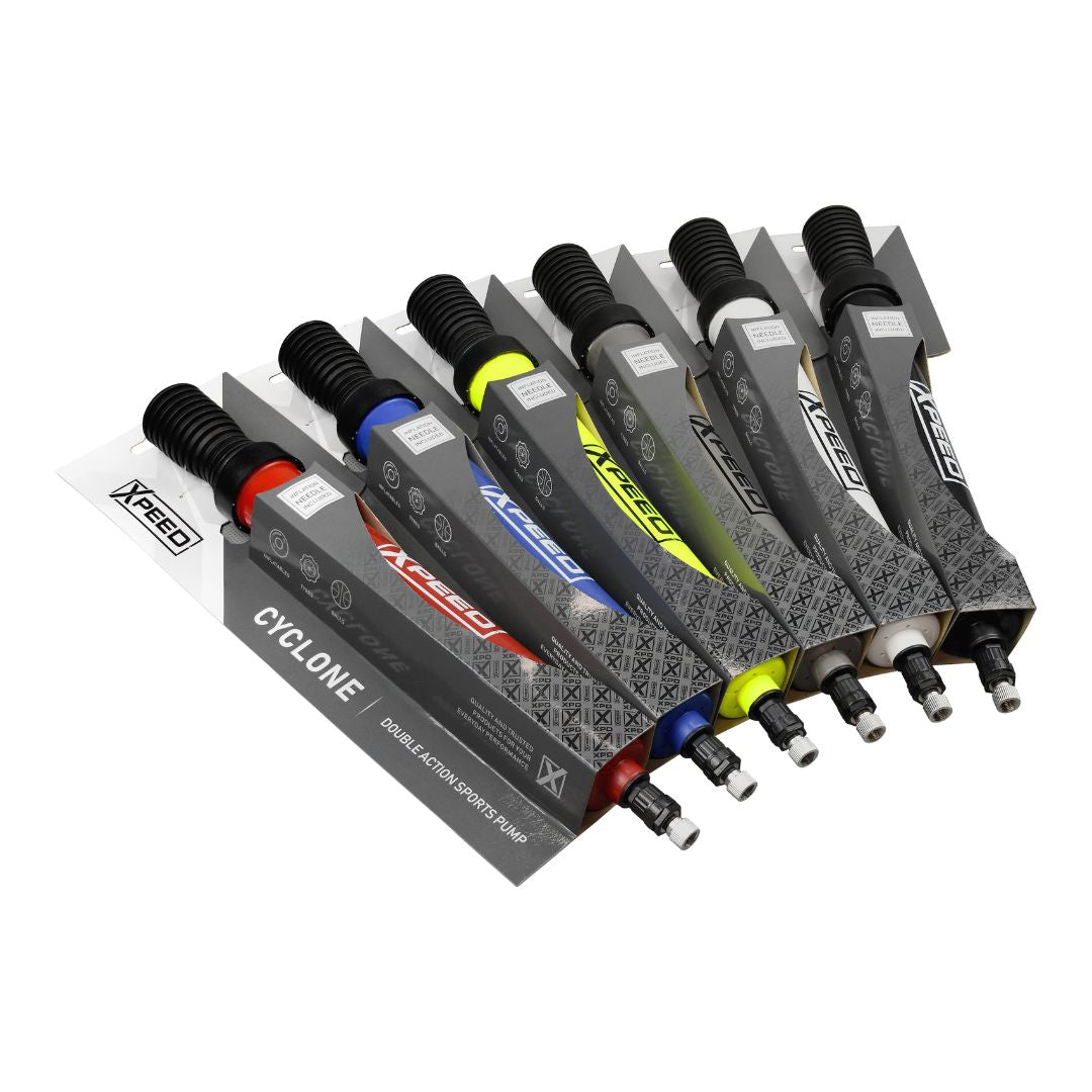 This 72 pack is the perfet sports store purchase. Get game-ready quicker with the Xpeed Cyclone Double Action Pump. Efficient, compact and easy to use. Whether you're inflating footy balls, netballs or bike tyres, this versatile tool delivers strong airflow on both the push and pull.